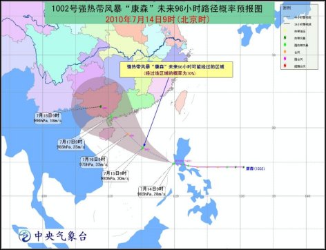 預計,“康森”將以每小時20公里左右的速度繼續(xù)向西偏北方向移動,未來有可能再次在南海海面加強為臺風,然后逐漸向廣東臺山到海南萬寧一帶沿?拷⒂锌赡苡16日夜間到17日下午在這一帶沿海登陸。
