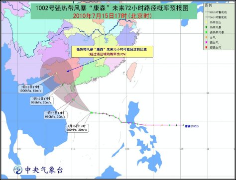 預(yù)計(jì),“康森”將以每小時(shí)15-20公里的速度向西偏北方向移動,強(qiáng)度還將有所增強(qiáng),有可能發(fā)展為臺風(fēng),將于16日中午到夜間在海南文昌到三亞一帶沿海登陸。