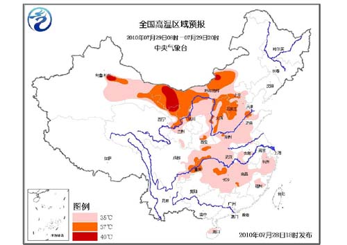 中央氣象臺(tái)發(fā)布的高溫黃色預(yù)警稱(chēng):明天(29日)白天,北京、天津、河北大部、山西、陜西關(guān)中地區(qū)和東部、寧夏中北部、河南大部、山東中西部、安徽北部、湖北、四川盆地東部、重慶、貴州東北部、湖南大部、江西中北部、浙江大部、福建北部、海南北部等地有35℃以上的高溫天氣,局地最高氣溫可達(dá)37~38℃;內(nèi)蒙古中西部、甘肅大部、新疆吐魯番盆地及南疆盆地東部等地將有35~37℃的高溫天氣,局地最高氣溫可達(dá)40℃以上。