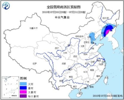 預(yù)計(jì),7月30日20時(shí)到7月31日20時(shí),河北東北部、京津地區(qū)東部、遼寧東部、吉林中南部等地有大雨或暴雨,其中,遼寧東部、吉林南部等地的部分地區(qū)有大暴雨;上述局地并伴有短時(shí)雷雨大風(fēng)等強(qiáng)對流天氣。