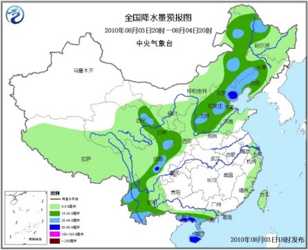 3日20時(shí)至4日20時(shí),西藏大部、青海中東部和南部、西北地區(qū)中東部、內(nèi)蒙古中東部、東北大部、華北、黃淮東部和北部、江蘇南部、浙江東部、福建東部、廣東南部、廣西南部、海南、四川盆地西部、云南、臺灣等地有小到中雨或陣雨,其中,內(nèi)蒙古東北部和東部偏南地區(qū)、黑龍江西北部和中部偏南地區(qū)、吉林中西部、遼寧西部和中北部、河北東北部和中南部、天津、山東北部、四川盆地西部、甘肅南部、云南西部和南部、廣西南部沿海、雷州半島及海南等地有大雨,部分地區(qū)有暴雨,上述局地并伴有短時(shí)雷雨大風(fēng)等強(qiáng)對流天氣。