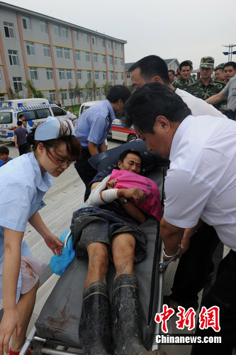 趕赴清平災(zāi)區(qū)救援的第一架救援直升機(jī)降落在綿竹漢旺中學(xué)操場上,隨機(jī)救出的4名傷員被立即送往綿竹市人民醫(yī)院急救。中新網(wǎng) 王義超 攝