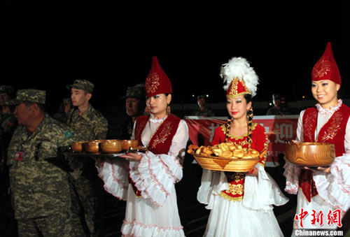 在奧塔爾市火車站站臺上舉行的簡樸而隆重的歡迎儀式上,用中、俄兩種文字書寫的“熱烈歡迎‘和平使命-2010’聯(lián)合反恐軍事演習(xí)中方參演部隊(duì)”的橫幅格外醒目,哈方軍樂隊(duì)高奏中、哈兩國國歌,3位哈薩克斯坦盛裝少女手捧當(dāng)?shù)靥厣拿谰、美食,獻(xiàn)給風(fēng)塵仆仆的中方參演官兵。隨后,站臺另一側(cè),中方參演部隊(duì)列車第一車隊(duì)攜行裝備,也在緊張有序地進(jìn)行卸載。
