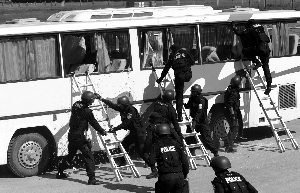 一輛旅游大巴車被“歹徒”“劫持”,一輛警用裝甲車突然頂住客車的車頭,迫使客車停止行駛。特警三人一組,破窗進(jìn)入客車,幾秒鐘后,數(shù)名“歹徒”先后被控制住。昨日,北京公安特警和武警首次舉行反恐處突綜合實(shí)戰(zhàn)演練,向中外媒體、在京駐華使館安全官和警務(wù)聯(lián)絡(luò)官展示北京警方反恐能力。