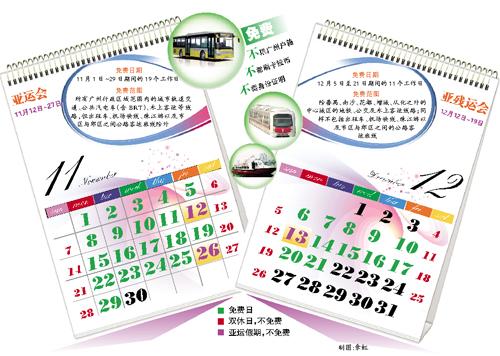 在亞運(yùn)會(huì)及亞殘運(yùn)會(huì)機(jī)動(dòng)車單雙號(hào)限行的46天期間(11月1日至29日、12月5日至21日),剔除13個(gè)雙休日和3天亞運(yùn)假期后的30個(gè)工作日里,廣州公共交通服務(wù)免費(fèi)。