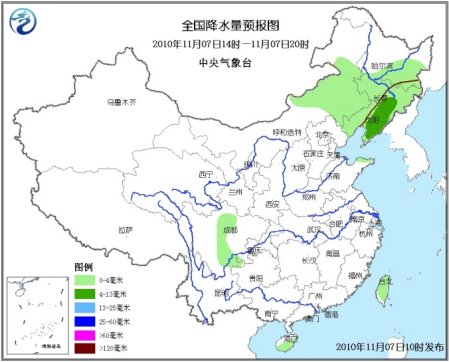 今天14時至20時,內(nèi)蒙古中東部有小到中雪;黑龍江南部、吉林西部、遼寧西部等地有雨夾雪;遼寧東部、吉林東部、山東半島北部、川西高原東部、云南東北部、海南南部、臺灣大部有小到中雨或陣雨。