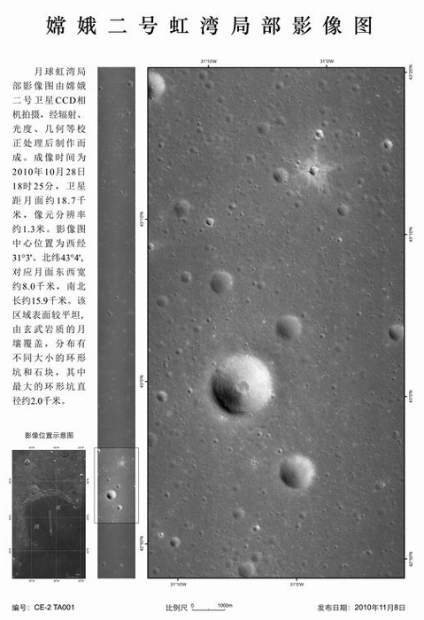 據(jù)中央電視臺(tái)報(bào)道,首次公布的月球虹灣地區(qū)局部影像圖是一張黑白照片。據(jù)國(guó)防科技工業(yè)局有關(guān)負(fù)責(zé)人介紹,該影像成像時(shí)間為10月28日18時(shí),是衛(wèi)星距離月面大約18.7公里地方拍攝獲取。影像圖的傳回,標(biāo)志著嫦娥二號(hào)任務(wù)所確定的六個(gè)工程目標(biāo)已經(jīng)全部實(shí)現(xiàn)。這意味著探月工程二期“嫦娥二號(hào)”工程任務(wù)取得圓滿成功。