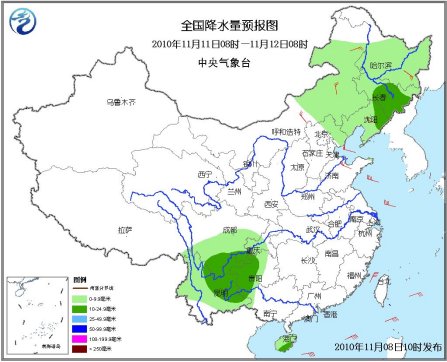 11日08時至12日08時,內(nèi)蒙古東部、東北地區(qū)有小到中雪,其中東北地區(qū)南部的部分地區(qū)有大到暴雪;西南地區(qū)東部有小到中雨;華北、東北等地有4-5級風。
