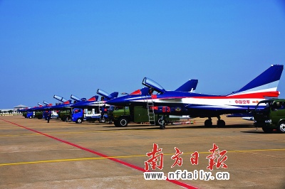 昨日中午12點15分,中國空軍八一飛行表演隊已經(jīng)飛抵珠海。伴隨著飛機(jī)引擎的轟鳴,3架以藍(lán)、白、紅為主色的殲10出現(xiàn)在珠海航展中心上空。3架飛機(jī)宛如三把直刺長空的利劍,連續(xù)兩次掠過藍(lán)天,然后相繼在珠海機(jī)場降落。約12點45分,另外4架殲10也相繼到達(dá)(見圖,陳俊攝)。這意味著換裝殲10飛機(jī)后的航展期間,八一飛行表演隊每天都將進(jìn)行一場飛行表演,準(zhǔn)備了18套動作,每次表演時間約22分鐘。