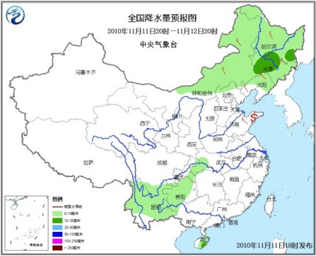 11日20時至12日20時,內(nèi)蒙古中東部、東北大部、河北西北部等地有小到中(雨)雪或雨夾雪,其中,內(nèi)蒙古東部偏南地區(qū)、遼寧北部、吉林大部、黑龍江東南部等地有大雪,內(nèi)蒙古東部偏南地區(qū)、吉林中部、黑龍江東南部等地的部分地區(qū)有暴雪;川西高原南部、重慶東部、湖北西南部、云南大部、貴州大部、廣西西部、海南大部等地有小到中雨。內(nèi)蒙古西部和東部、華北、東北地區(qū)、黃淮等地有4~6級風。山東半島附近有揚沙或浮塵天氣。渤海、黃海北部和中部將有7~8級、陣風9級的西北風;臺灣海峽、臺灣以東洋面和以南海域、南海東北部海域?qū)⒂?~8級的東北風。