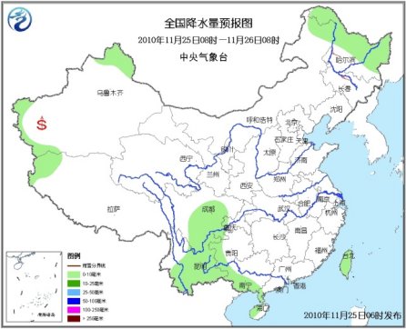 25日08時(shí)至26日08時(shí),新疆北部和西南部局部、西藏西部、黑龍江北部和東部等地有小雪(雨)或雨夾雪;四川中南部、云南大部、貴州西部、廣西西部和南部、海南西部以及臺灣等地有小雨或陣雨。東北北部等地有4~5級偏北風(fēng),東南部沿海有5~7級風(fēng);南疆盆地西部有揚(yáng)沙或浮塵天氣。。