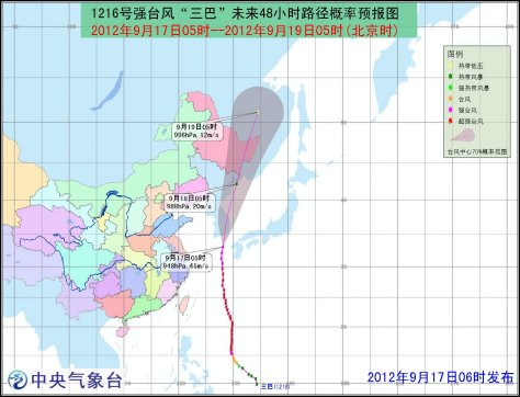 今年第16號超強(qiáng)臺風(fēng)“三巴”于昨日(16日)20時減弱為強(qiáng)臺風(fēng),今晨5時,中心附近最大風(fēng)力有14級(45米/秒),中心最低氣壓為948百帕。預(yù)計(jì)“三巴”將于17日中午前后登陸,登陸地點(diǎn)鎖定在韓國南部一帶沿海,強(qiáng)度逐漸減弱。受“三巴”影響,東北地區(qū)中東部將有中到大雨,部分地區(qū)有暴雨。