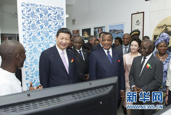 3月30日,國(guó)家主席習(xí)近平同剛果共和國(guó)總統(tǒng)薩蘇在布拉柴維爾出席恩古瓦比大學(xué)圖書(shū)館啟用和中國(guó)館揭牌儀式。這是習(xí)近平和夫人彭麗媛在薩蘇和夫人陪同下來(lái)到中國(guó)館,同學(xué)習(xí)中文的師生親切交流。新華社記者 黃敬文 攝