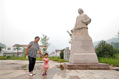 昨日,密云縣張家墳村,鄧玉芬的孫媳婦帶著孫女在鄧玉芬雕像前。新京報記者 王遠征 攝