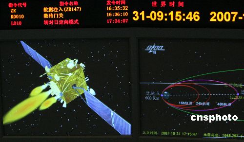 北京時(shí)間十月三十一日十七時(shí)十五分,北京航天飛行控制中心成功對(duì)“嫦娥一號(hào)”衛(wèi)星實(shí)施第三次近地點(diǎn)變軌,也是衛(wèi)星入軌后的第四次變軌,衛(wèi)星順利進(jìn)入地月轉(zhuǎn)移軌道,由此真正開(kāi)始了她的奔月之旅。 中新社發(fā) 孫自法 攝