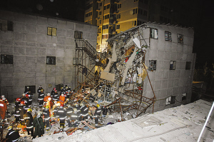 昨晚10時許,發(fā)生坍塌的工棚西半邊已經(jīng)整體缺失,東半邊支架亦扭曲變形。數(shù)十名消防人員和兩條搜救犬正在現(xiàn)場緊張搜救,十余輛急救車在現(xiàn)場待命,大批警察趕到現(xiàn)場維持秩序,上千群眾圍觀。不時有急救車警笛長鳴拉著受傷人員離去。