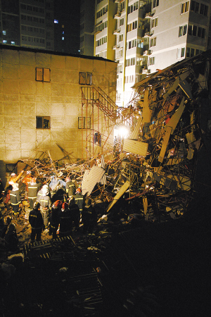 據(jù)樊女士介紹,事情發(fā)生在晚上9時10分許,她當(dāng)時聽見轟然一聲巨響,隨后發(fā)現(xiàn)工棚西半邊全塌了。她跑到陽臺上去看時,發(fā)現(xiàn)陸續(xù)有七八名工人從廢墟中爬出來,渾身白灰癱坐在院子里。這時有工人用手機打電話報警,但地方口音很重,加之一著急,說話非?欤蟛糠侄悸牪欢,她只聽出來工人說有二三十人被埋。由于工人無法告知警方準(zhǔn)確的出事位置,她趕緊拿起電話幫忙報警。
