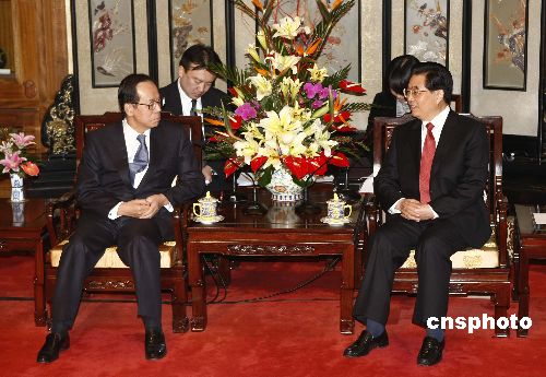 中國(guó)國(guó)家主席胡錦濤在北京釣魚臺(tái)國(guó)賓館養(yǎng)源齋會(huì)見日本首相福田康夫。中新社發(fā) 盛佳鵬 攝