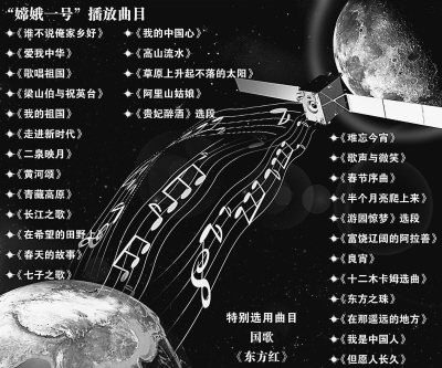 2006年7月7日,國防科工委宣布,要從數(shù)量龐大的中國樂曲中征集、遴選出30首優(yōu)秀樂曲,隨嫦娥一號衛(wèi)星搭載升空,在衛(wèi)星距地球38萬公里的月球軌道上播放,并公布了150余首建議曲目。同年10月6日,國防科工委宣布,以公眾投票票數(shù)的多少決出了《誰不說俺家鄉(xiāng)好》、《愛我中華》、《歌唱祖國》等30首歌曲。而我國的國歌《義勇軍進行曲》和由我國第一顆人造地球衛(wèi)星“東方紅一號”在太空奏響的樂曲《東方紅》因其特殊的地位,將另行安排在嫦娥一號衛(wèi)星上搭載播放。