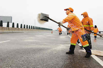 在寒風中撒了3個小時鹽的長潭高速公路養(yǎng)護工劉建軍感到既冷又累,他說:“靠人工,終究不是辦法!