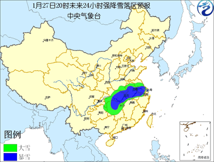中新網(wǎng)1月27日電 中國中央氣象臺今天下午六點鐘發(fā)布最高等級的暴雪紅色警報,顯示湘鄂豫皖蘇等地的部分地區(qū)有暴雪。