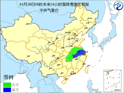 中新網(wǎng)1月28日電 中央氣象臺今天早晨六點(diǎn)鐘繼續(xù)發(fā)布暴雪紅色警報:受冷暖空氣的共同影響,預(yù)計(jì)今天白天到夜間,湖南北部、湖北東部、河南東南部、安徽大部、江蘇大部以及浙江西北部等地有大雪,其中,安徽中南部、江蘇中南部、湖北東南部等地的部分地區(qū)有暴雪。
