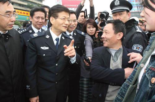 下午2點(diǎn)30分,孟建柱和隨行的公安部黨委委員、部長助理鄭少東一行來到廣州火車站廣場。一下車,孟建柱就走進(jìn)正在廣場候車的人群當(dāng)中,向幾位分別返回湖北襄樊、四川廣安的務(wù)工人員詳細(xì)了解出行情況:乘車到哪里?車票買到?jīng)]有?候車是否安全?正在排隊(duì)候車的旅客聽說公安部部長來了,紛紛走過來和部長握手,他們激動地說:“看到您在這兒,我們感到很安全,心也放下了!
