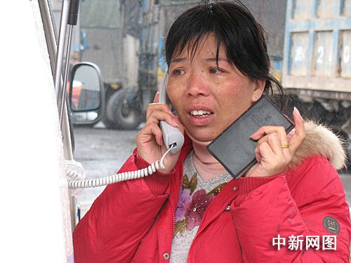 一月二十八日傍晚,廣東京珠北韶關境內,來自湖北襄樊的龐女士一邊流淚一邊與家人報平安。因冰雪擋道,龐女士乘坐的客車被迫滯留路上。中國移動韶關分公司免費提供流動無線電話車讓滯留旅客向家人報平安。