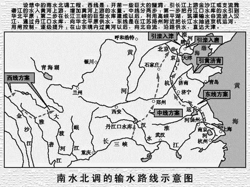 南水北調(diào)工程輸水示意圖。西線:開鑿一些巨大的隧洞,引長(zhǎng)江上游金沙江或支流雅礱江的水入黃河上游,增加黃河上游的水量。中線分兩步:第一步把丹江口水庫(kù)的水引到華北平原;第二步在長(zhǎng)江三峽的巨型水庫(kù)建成以后,利用高峽平湖,筑渠輸水自流進(jìn)入漢江,通過丹江口水庫(kù),向華北平原供水。東線:在江蘇揚(yáng)州附近把長(zhǎng)江水抽進(jìn)京杭運(yùn)河,用閘控制,逐級(jí)提升;在山東境內(nèi)過黃河以后,向北自流,沿路供水,直達(dá)天津。