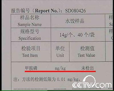 這家工廠的檢驗記錄顯示,每一批次的蔬菜在進(jìn)廠前都會由河北檢驗檢疫部門進(jìn)行抽檢或由企業(yè)送檢。相關(guān)的檢測結(jié)果顯示,在生產(chǎn)2007年10月1日和10月20日兩個批次的豬肉白菜餡餃子之前都進(jìn)行過相關(guān)的檢驗,洋白菜、大白菜以及韭菜、姜、蒜的檢測中都沒有檢出甲胺磷等高毒高殘留農(nóng)藥。