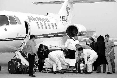 在新鄭國際機場的停機坪內(nèi),記者看到一架紅白相間的小型噴氣式飛機,機身上紅色十字的救護標志十分醒目,飛機降落后,飛機內(nèi)的外籍機務(wù)人員和護士用專用的醫(yī)用擔(dān)架,將正在熟睡中的鄭麗抬下飛機,送上機場的120急救車,然后送往鄭州市內(nèi)一家醫(yī)院,整個過程用了半個小時。
