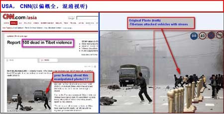 聲明中寫道:“一個叫‘’的網(wǎng)站和其他一些地方對于CNN在西藏事件上的報道點名批評!睂τ谥袊W(wǎng)民對CNN將一張圖片中“藏獨”分子向卡車投擲石塊的畫面進行剪裁的不滿,CNN辯稱,“受到質(zhì)疑的那幅照片被完全‘適當(dāng)?shù)亍瘧?yīng)用在了特定的編輯內(nèi)容中”,并稱所展示的內(nèi)容不會引起誤解。