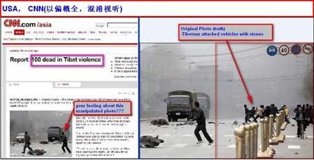 3月17日,CNN網(wǎng)站上使用了一張拉薩事件的圖片,圖中兩輛軍車正向兩名平民駛來(lái)--事實(shí)上,如果完整展示圖片的話,可以看到當(dāng)時(shí)軍車旁有約10名暴徒在向軍車投擲石塊,顯然CNN網(wǎng)站的圖片故意剪裁了暴徒向軍車投擲石塊的圖像。