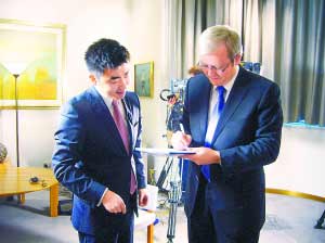 在陸克文的辦公室里中國文化元素隨處可見,陸克文特別喜歡一幅“旗開得勝”畫卷。日前,央視經(jīng)濟(jì)頻道主持人芮成鋼前往陸克文辦公室對(duì)這位“中國通”進(jìn)行了專訪。問答摘編如下。