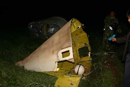 約莫15分鐘,在一個(gè)觀察哨值勤的觀察員王世華突然報(bào)告,稱殘骸就落在他附近約200米的山溝里,殘骸目標(biāo)已發(fā)現(xiàn)。山溝里沒有住戶,未造成人員傷亡和房屋、林木的損毀。