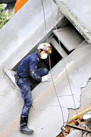 新加坡救援隊(duì)隊(duì)員在廢墟上搜尋生命跡象。