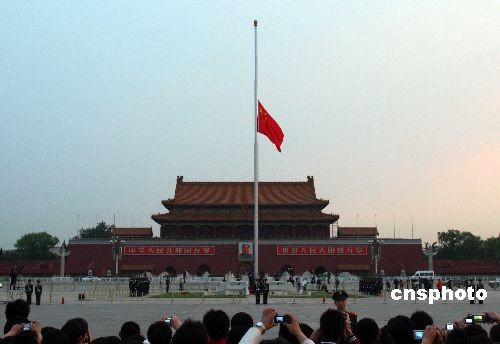 中新網(wǎng)北京5月19日電 五月十九日凌晨四時(shí)五十七分四十秒,北京天安門廣場(chǎng)下半旗,沉痛哀悼在汶川特大地震中的遇難者。