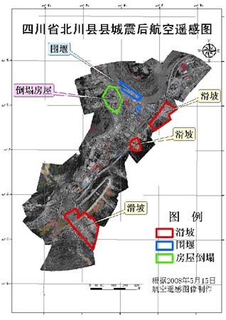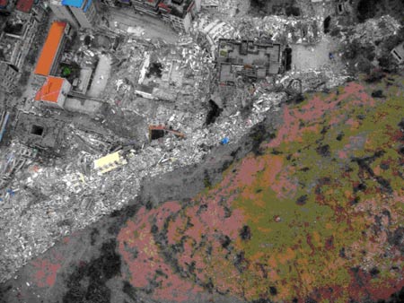 四川汶川8.0級強烈地震發(fā)生后,民政部國家減災(zāi)中心組建技術(shù)工作組趕赴四川地震災(zāi)區(qū)開展災(zāi)情評估工作。5月15日上午,工作組利用小型無人駕駛飛機在重災(zāi)縣北川進行了航拍,共獲取北川縣城南部地區(qū)高清晰航拍照片與視頻影像。并與首都師范大學(xué)合作對數(shù)據(jù)進行判讀。