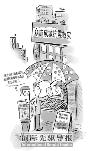 國(guó)際先驅(qū)導(dǎo)報(bào)文章 中國(guó)發(fā)生“5·12”汶川大地震之后,西方媒體給予了大量積極正面的報(bào)道。一直以來(lái)認(rèn)為“中國(guó)媒體不可信”的西方媒體,比如CNN、BBC等,在此次地震報(bào)道中都大量使用了中國(guó)媒體的電視畫(huà)面和文字報(bào)道,這十分少見(jiàn)。與之前報(bào)道西藏“3·14事件”、“奧運(yùn)圣火傳遞”相比,西方媒體報(bào)道的態(tài)度來(lái)了個(gè)180度的大轉(zhuǎn)彎。即使有少量負(fù)面報(bào)道和批評(píng)聲音,但這些已經(jīng)讓西方讀者覺(jué)得不那么可信了。西方民眾、媒體評(píng)論人,總體上都正面評(píng)價(jià)中國(guó)政府組織的抗震救災(zāi),以及贊揚(yáng)中國(guó)人民在災(zāi)難面前表現(xiàn)出來(lái)的勇氣。