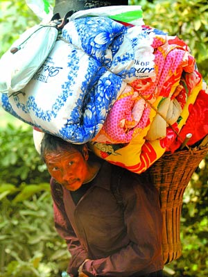 昨日,一名災(zāi)民背著搶救出來(lái)的家什,從南壩撤離。