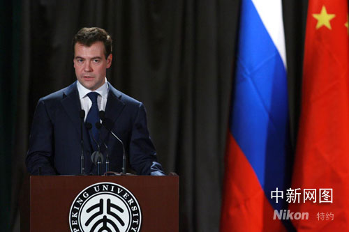 中新網(wǎng)5月24日電 俄羅斯總統(tǒng)梅德韋杰夫今天下午在北京大學發(fā)表演講時說,俄中關系最近幾年達到了前所未有的高水平,發(fā)展迅速、內(nèi)容廣泛,很重要的是兩國之間給予相互信任,雙方一致認為伙伴關系既可靠,又有前途。