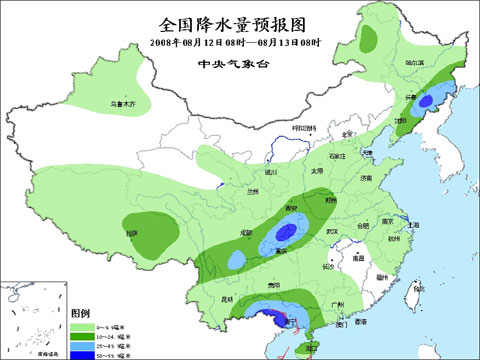 2008年8月12日8時-13日8時全國降水量預(yù)報圖