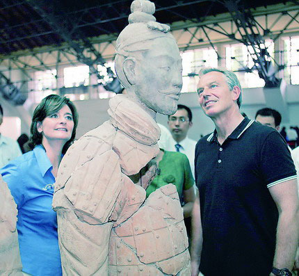 中國(guó)人民外交學(xué)會(huì)的邀請(qǐng),英國(guó)前首相布萊爾作為奧運(yùn)會(huì)貴賓于8月15日至23日訪華。8月18日下午,布萊爾攜同家人專程來(lái)陜參觀了秦始皇兵馬俑博物館。省長(zhǎng)袁純清陪同參觀。