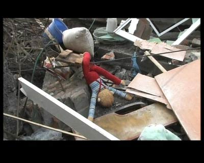 馮小寧:我下來的時候就不是為了拍一個電影而下來,現(xiàn)在到了北川以后,我有這么多天以后,我有更強烈的一個感受,我不拍,我不會拍,我可以寫,我手中有第一手的資料,我也有拍攝這種災(zāi)難大片的超常的本事,我無法去用電影的真實再營造那種災(zāi)難,摧毀我們那么多生命的這種過程,這是我從良心深處不愿意做的事情。因為我可以營造一切故事、氣氛,這么多真實的東西都是最感人的素材,但是有一點我做不到,就是我無法去營造地震的瞬間,那么多活生生的生命,那種慘狀,我不能再現(xiàn)它,我受不了。我設(shè)想我們做電影的可以重現(xiàn)那些東西,孩子們從教室中向外奔跑,最后塌下來,把他們壓倒,做不到。而且我在災(zāi)民之中,我深知如果這些電影再讓他們看見的時候,是對他們多么強大的一種人性上的摧殘,對所有活著的那些上百萬的四川災(zāi)民。就在給我開車的那個司機(jī)朋友,實際上他也是個干部,他就說到,他的夫人,其實大家在電視中就知道,就是剛出生三個月的嬰兒,他愛人都一起被砸在里邊,然后他說太感動了,母愛的偉大,自己在里頭三四天,才被救出來,自己都生命都不保,但是還喂嬰兒,喂她的孩子,我覺得他們才真讓我們覺得驚訝,就是一個普通的朋友,為我們開車,他的故事就可以說驚動全世界。他們有句話,說我們北川幾萬個家庭,每一個家庭都是驚心動魄的故事。坐在車后頭坐的一個工程師,他一家人都沒了,就剩他孤身一個,因為什么?正好他那天出差,到旁邊的一個縣去出差,回來以后都沒了。第二天我們?nèi)ケ贝ǖ膹U墟那兒拍攝的時候,他們就去,他說他的兒子開出租,那天正好在停車場那兒,出租車都停在那兒,地震發(fā)生以后,這些人就失蹤了,因為被一座山給埋了,整個山上的巨石,十米直徑的那種大巨石成群地滾下來,沒了。所以他走到那兒的時候他就說你看,我兒子就在這里頭,正好他們在那兒翻,翻到一個被砸碎的,車都砸得亂七八糟的,碎末,他從一個碎石縫里頭翻出,我看前保險杠,我拍下來了,他撿起了一個車牌,他說正好這個車牌就是我兒子的,后來大家就往前走,我就說了一句,我說你還是把它收起來吧,這是你孩子唯一的東西,因為家都沒了,孩子唯一的一個紀(jì)念物,他就把它收起來,拿一個塑料袋兜起來。