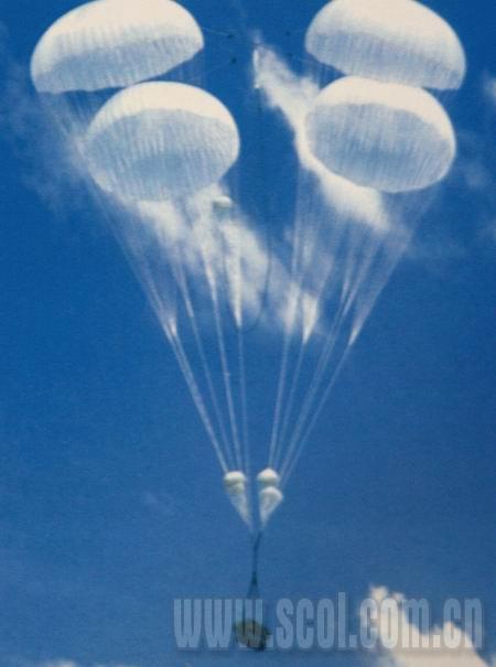 “神七”返回艙回收傘采用異型設(shè)計(jì),由紅白兩種顏色組成,傘兩邊的強(qiáng)力要比中間高。屆時,96根傘繩撐起回收傘,“神七”飛船返回艙將借助回收傘以完美的姿勢落地。