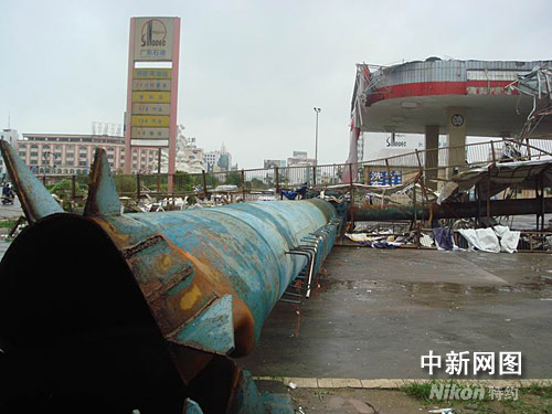 圖為市區(qū)一家具商場的門面被風雨摧毀。