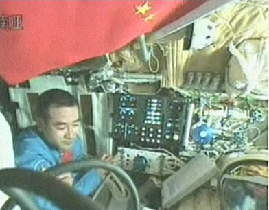 據(jù)報道,在神七傳回的艙內(nèi)畫面顯示,軌道艙內(nèi)航天員正在組裝航天服,艙內(nèi)有一面紅色的旗幟,經(jīng)確認過這是一面五星紅旗。