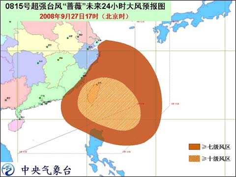 中新網(wǎng)9月27日電 據(jù)中國天氣網(wǎng)消息,中央氣象臺2008年9月27日18時發(fā)布臺風(fēng)紅色警報(bào)稱:預(yù)計(jì),今年第15號超強(qiáng)臺風(fēng)“薔薇”將以每小時20-25公里的速度向西北方向移動,逐漸向臺灣東部一帶沿?拷瑢⒂诿魈熘形绲揭归g在臺灣宜蘭到臺東一帶沿海登陸。