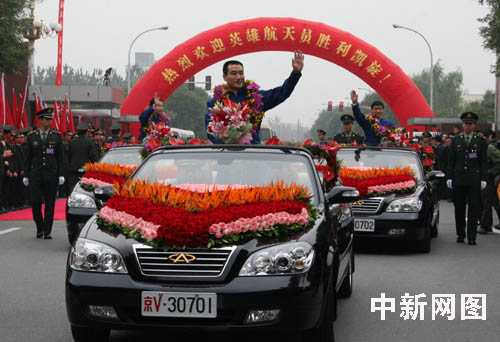 翟志剛、劉伯明、景海鵬三人乘坐敞篷車,頻頻向民眾揮手致意。而成千上萬的民眾夾道歡迎,甚至有人奔跑著跟隨在他們身后,還有人燃放鞭炮慶祝,場面十分熱烈。