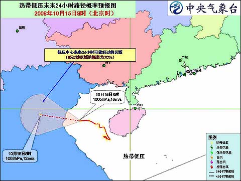 中央氣象臺2008年10月15日10時發(fā)布熱帶低壓消息:目前在北部灣海面活動的熱帶低壓的中心今天上午8時位于越南清化省清化市東南方大約125公里的海面上,就是北緯19.2度、東經(jīng)106.8度,中心附近最大風(fēng)力有7級(16米/秒)。
